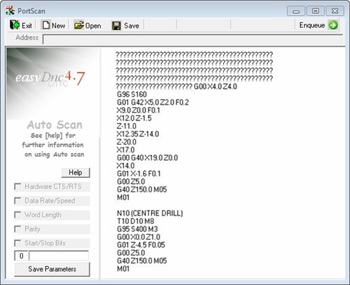 Go to the CNC console and punch/send out a sizable program. You should see garbage data appear on easyDnc’s port scan window but after a few lines easyDnc should detect the parameters and focus in on the data. Clear readable text should begin to appear.