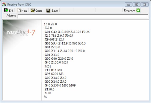 The receive window also functions as an editor where you can edit the data before saving if required. Alternatively you can click the ‘Enqueue’ button to load the edited data into the easyDnc transmit buffer and send it right back to the CNC. |
